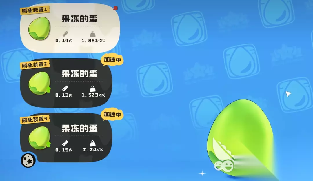 这三个蛋和普通的果冻不太一样,它们分别可以孵化出三种不同形态的果冻进化型。第一个蛋能孵化出熔岩布丁,第二个蛋孵化出来的是抹茶布丁,第三个蛋则是椰浆布丁。这三种布丁的属性和技能都有些区别,玩家可以根据自己的需求来培养。除了这三个蛋之外,在下水道里面到处都能遇到野生的果冻,如果玩家想多抓几只的话,记得提前准备好咕噜球。