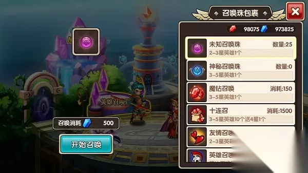 《英雄召唤》的一大特色就是英雄多,集合了来自火、水、风、光、暗五系属性的300多名英雄。我们可以通过未知召唤珠、神秘召唤珠、魔钻召唤,十连招、友情召唤以及英雄召唤书等六种召唤方式,通过这;六种召唤方式可以召唤到一到五星,不同属性不同星级的英雄。
