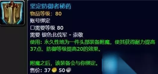 3、坚定防御者秘药 需要 银色北伐军 - 崇敬 使用: 永久性地为一件头部装备附魔,使其获得耐力提高37点、防御等级提高20的效果。 附魔之后,该装备会与你绑定。