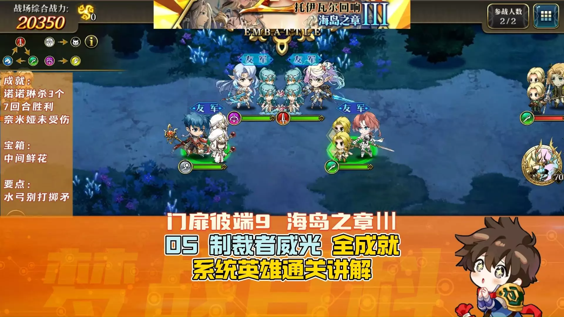 这是《梦幻模拟战》门扉彼端14山林之章Ⅲ的豪山罡关卡攻略,展示了用系统英雄达成我方无人阵亡、3回合内获胜的全成就过程,还标注了宝箱位置。