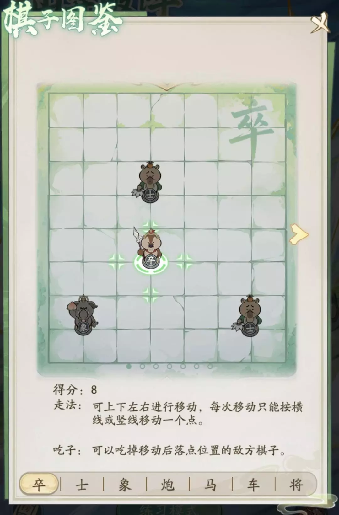 知己知彼,百战百胜,每个棋子的移动和吃子规则不同,道友可以在【棋子手册】内查看~