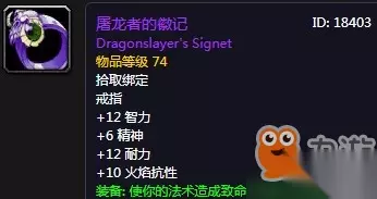 魔兽世界怀旧服任务奖励介绍 玩家击杀了奥妮克希亚后有几率掉落奥妮克希亚的头颅,联盟的玩家可以带到伯瓦尔・弗塔根公爵处完成任务“联盟的胜利”,部落的玩家可以带到萨尔处完成任务“部落的胜利” 魔兽世界怀旧服龙头不能直接换装取装备,只能触发任务。任务完成后可以在奥妮克希亚龙血护符(饰品:招架+1%、防御+8、每5秒回7点生命值)、屠龙者的徽记(戒指:法术致命一击+1%)、奥妮克希亚龙牙坠饰(项链:致命一击+1%、命中+1%)这三个装备中选择获得一个。 魔兽世界怀旧服黑龙龙头任务奖励有三个: 屠龙者的徽记 (法系推荐戒指)