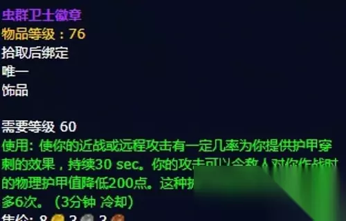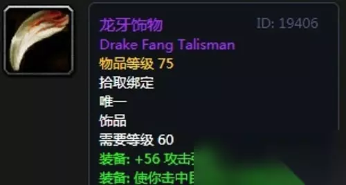 18、龙牙饰物:饰品1,黑翼之巢副本埃博诺克掉落,无法附魔。 装备属性:无基础属性,装备效果 +56 攻击强度,使你击中目标的几率提高2%,使你躲闪攻击的几率提高1%。