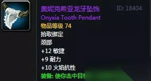 2、奥妮克希亚龙牙坠饰:项链,出自黑龙公主任务线奖励; 装备属性:+12敏捷,+9耐力,+10火焰抗性,装备效果使你击中目标的几率提高1%,使你造成爆击的几率提高1%。