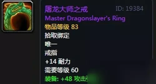 17、屠龙大师之戒:戒指2,黑翼之巢任务获取,无法附魔 装备属性:+14耐力,装备效果+48 攻击强度,使你击中目标的几率提高1%。