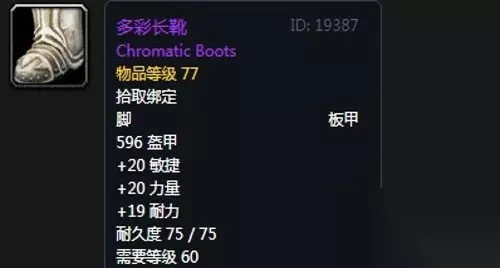 15、多彩长靴:脚部,出自黑翼之巢副本克洛玛古斯掉落,推荐附魔初级速度。 装备属性:596护甲,+20力量,+20敏捷,+19耐力,装备效果使你击中目标的几率提高1%。