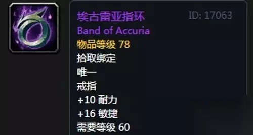 16、埃古雷亚指环:戒指1,出自熔火之心拉格纳罗斯掉落,无法附魔。 装备属性:+16敏捷,+10耐力,装备效果使你击中目标的几率提高2%。
