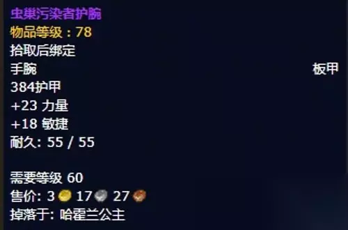 6、虫巢污染者护腕:护腕,出自安其拉副本哈霍兰公主掉落,推荐附魔超强力量; 装备属性:384护甲,+23力量,+18敏捷,无装备效果。