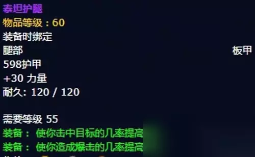 14、泰坦护腿:腿部,出自锻造专业制作,推荐附魔次级奥术融合。 装备属性:598护甲,+30力量,装备效果使你击中目标的几率提高2%,使你造成致命一击的几率提高。
