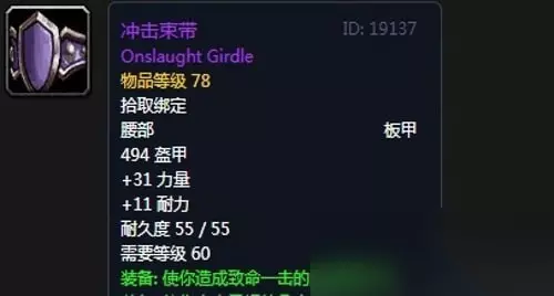 13、冲击束带:腰带,出自熔火之心副本拉格纳罗斯掉落,无法附魔。 装备属性:494护甲,+31力量,+11耐力,装备效果使你造成爆击的几率提高1%,使你击中目标的几率提高1%。