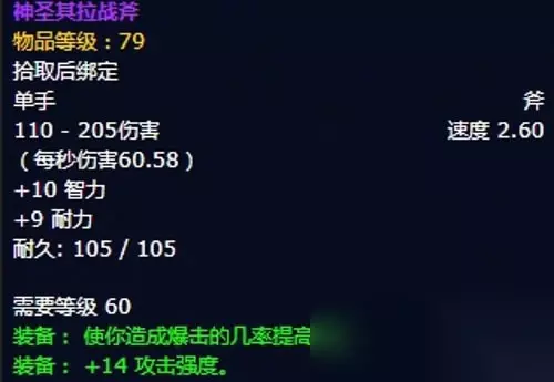 8、神圣其拉战斧(兽人):单手斧,出自安其拉副本任务获取,推荐附魔十字军。 装备属性:110-205伤害,攻速2.60,+10智力,+9耐力,装备效果使你造成爆击的几率提高1%,+14 攻击强度。