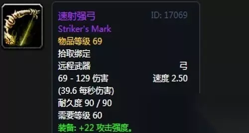 11、速射强弓:远程武器,出自熔火之心玛格曼达,无法附魔; 装备属性:69-129伤害, 攻速2.50,装备效果+22 攻击强度,使你击中目标的几率提高1%。