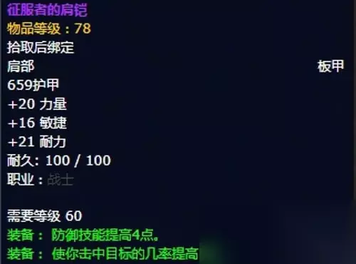 3、征服者的肩铠:肩部,安其拉任务获取,推荐附魔赞达拉力量徽记。 装备属性:659护甲,+20力量,+16敏捷,+21耐力,装备效果防御技能提高4点,使你击中目标的几率提高1%。 套装属性:(3) 组合 : 使战士的所有怒吼技能所消耗的怒气值减少35%。 (5) 组合 : 使雷霆一击的减速效果和伤害提高50%。