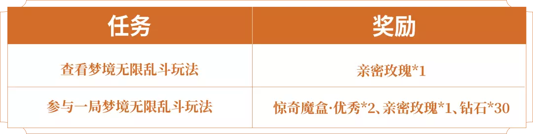 活动期间参与梦境无限乱斗玩法领惊奇魔盒、亲密玫瑰等奖励!