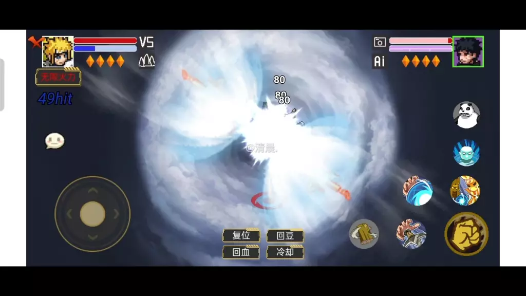 这是同人游戏《像素火影》的对战画面,展示了忍者角色间的忍术对战场景,角色释放技能展开激烈攻防,还有通灵兽助阵,呈现出精彩的像素风火影格斗内容。