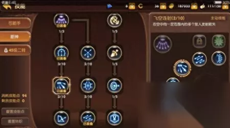 3、很重要的BUFF技能,加30%攻击和速度,这个神技恰恰弥补了箭神腿短的劣势。举个栗子,龙二里面boss开火车都很头疼吧,箭神又爱拉仇恨,预判boss开火车前,放个buff,跑直线让他追,轻松加愉快。 主动技能(刷图): 追踪箭,远程高输出,不用瞄准 聚能射击,远程高输出 箭雨风暴,远程多段持续高输出 追风箭,多段中距离输出 多段射击,远程多段高输出 另外,飞空连射输出也不错。 如图,因等级不够,所以现在佩戴的是追踪箭、聚能射击、飞空连射、追风箭、多段射击