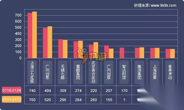点评:本周网页游戏研发商开服排行前三分别为:上海三七互娱、广州创思、无锡七酷;新增上榜研发商智远时空,旗下新作《九阴绝学》近期表现抢眼,排名暂列第七。本周开服榜单前三研发商共开服1542组,占榜单开服总数53.2%。