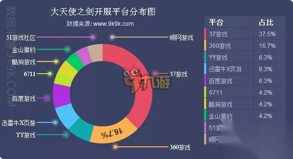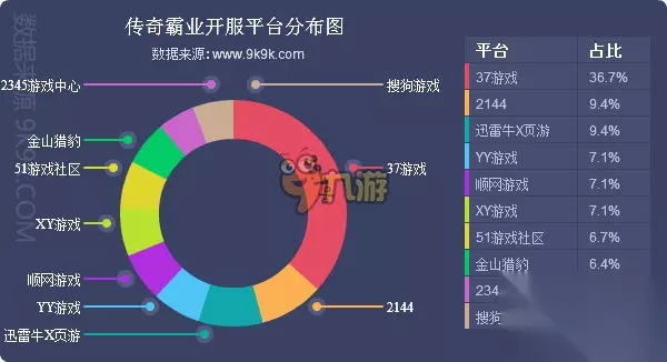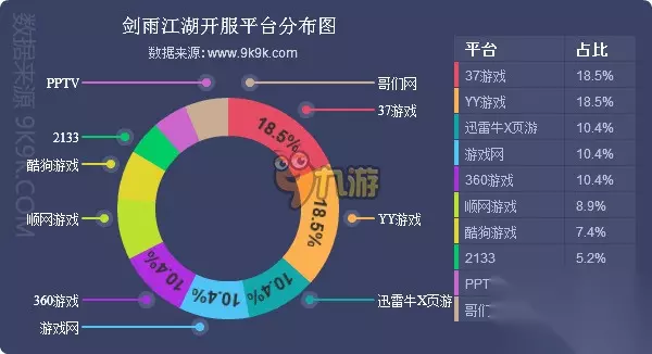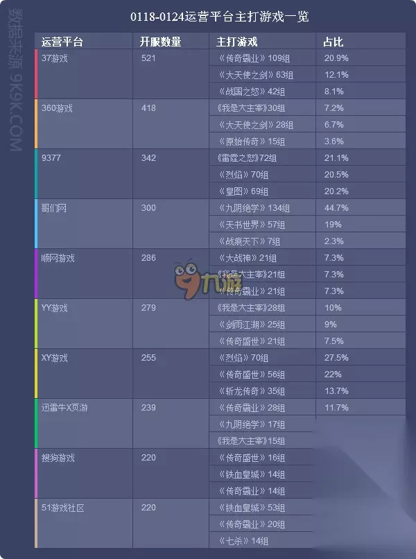 点评:《剑雨江湖》本周排名首次升至前五,据各平台开服占比来看,37游戏、YY游戏2家一线平台为主要发展阵地,其开服频率均在4服/天。《剑雨江湖》本周新入驻9377、2345游戏中心、金山猎豹、乐都网4家一线平台,发展潜力较大。