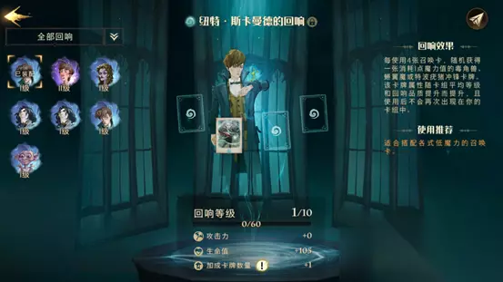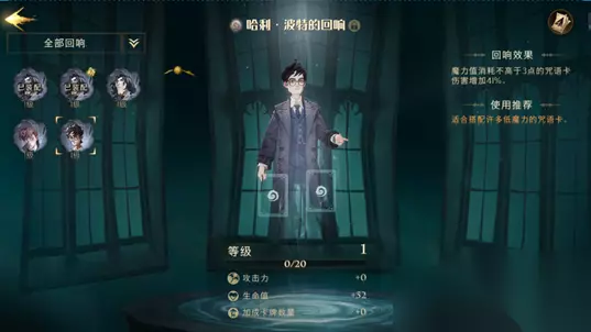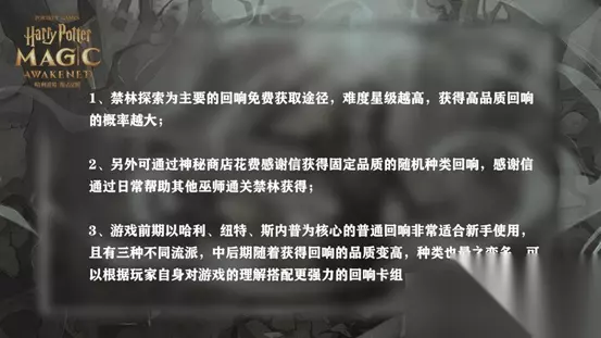 回响的获取心得总结: 1、禁林探索为主要的回响免费获取途径,难度星级越高,获得高品质回响的概率越大。 2、另外可通过神秘商店花费感谢信获得固定品质的随机种类回响,感谢信通过日常帮助其他巫师通关禁林获得。 3、游戏前期以哈利、纽特、斯内普为核心的普通回响非常适合新手使用,且有三种不同流派,中后期随着获得回响的品质变高,种类也最之变多,可以根据玩家自身对游戏的理解搭配更强力的回响卡组。