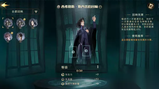 2. 斯内普的回响: 斯内普的回响效果为巫师每普攻一次,下次攻击为神锋无影效果,即可以弹射附近敌方目标,最多弹射2次,此时的普攻伤害将会根据回响品质降低一定百分比。 作为新手期的又一个极其容易获得的白色回响,斯内普的回响则在普攻这条路上展现了新优势,能出其不意靠普攻解掉对方的召唤物。 适用卡组基础卡推荐:【神锋无影】、【漂浮炸弹】、【嗅嗅】、【康沃尔郡小精灵】、【小蜘蛛群】、【妖怪们的妖怪书】、【火焰熊熊】、【气象咒】 新手期很难凑齐普攻的核心【时间转换器】、【闪回咒】,所以便围绕漂浮炸弹的爆炸效果集合能快速移动的召唤物进行半自动攻击。