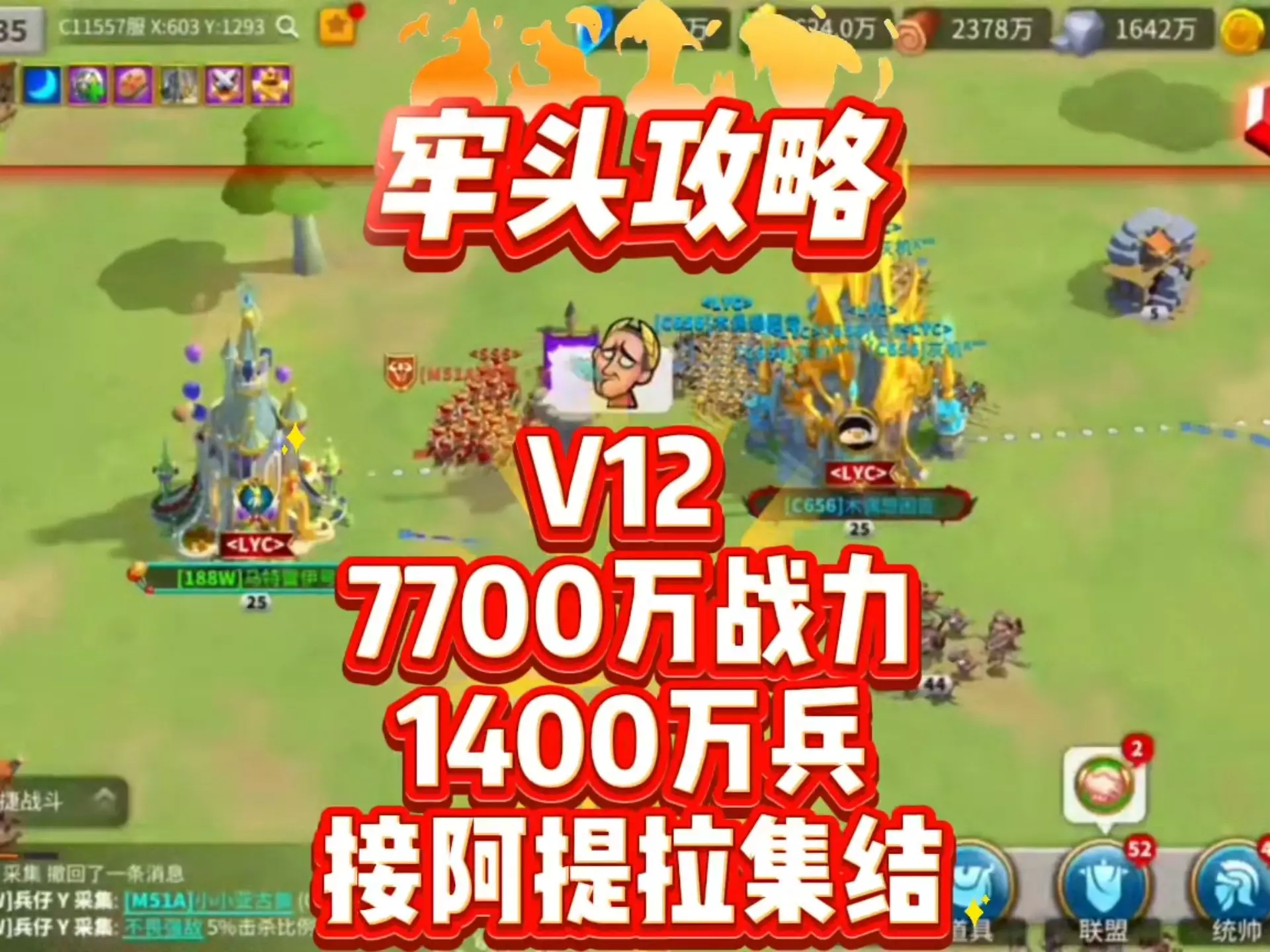 这是《万国觉醒》的玩法攻略,展示了600万纯步兵搭配德川、戈尔戈的阵容接集结的实战,该阵容输出强劲,一刀可打出20万伤害,还介绍了该阵容能出更多兵的优势。