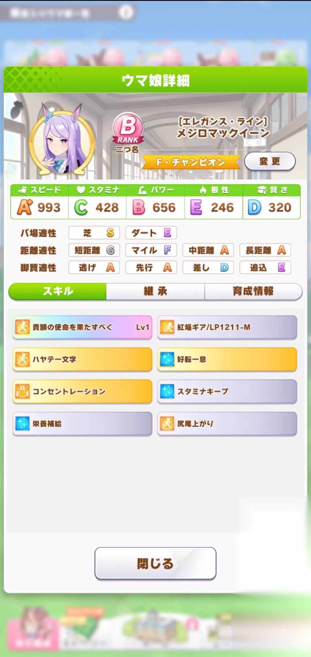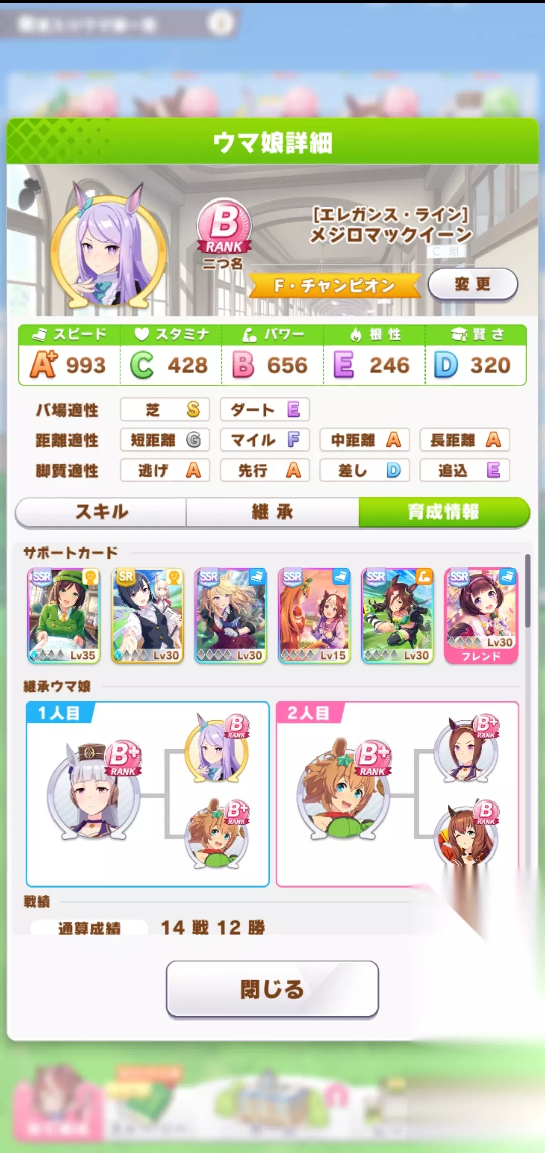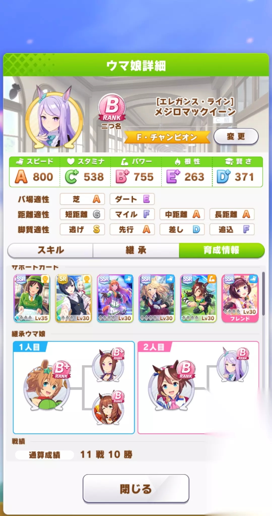 玩法推荐 跑步游泳互点,在中前期仍是主跑步副游泳。该例子突然决定决赛走中距离+大逃的主要原因是,第二次继承出了逃适应S。可以根据是否出逃S或者先行S决定决赛跑什么。不过逻辑上来说,这样培养出的麦昆,拉到育成外面打长距离是打不过的。 在决定URA类型之后,大逃性质要补相当多的耐力,后期可以改为主游泳副速度,游泳出人基本就可以点,毕竟我们礼装没带耐力相关,游泳不会出彩。 这次育成的麦昆我个人不太满意,除了逃S之外,白板属于有点拉闸的,后面玩了第二个更推荐的模式,供大家选择。 例子二 外部条件 个人礼装:见下图 培养策略:主跑步+副游泳(速度流+耐力流) 跑法:先行与大逃 距离:中距离+长距离,URA选的长距离,先行