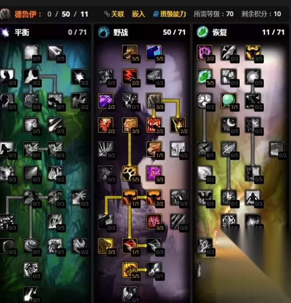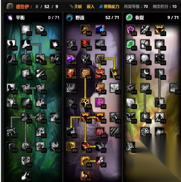 1 野性冲锋 2 斜掠+咆哮 3 横扫至空能量 4 开狂暴和猛虎 5 横扫至空能量 6 空能后变熊开激怒,横扫 7 切回猫重复1-6 魔兽世界wlk野德天赋加点 1.野德天赋加点推荐,推荐 0/52/9、0/50/11和0/52/9加点。 2.狂暴+原始血腥流,狂暴状态下猫的技能消耗减半。