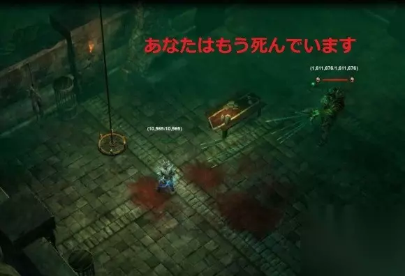 这个技能必须重点强调一下,典狱长的招牌杀人技能。 A.它的伤害究竟有多高? 图中的角色是我在穿刺、虚化、流血三种抗性全部堆到80%之后进行示范的结果,可以看到我才吃到15针当中的两针而已,却已经掉了半血。 终极难度下会有更多的抗性惩罚,事实上萌新打典狱长往往没有意识到,或是很难堆满这三种抗性,在这种情况下,基本就是吃到1针半残,吃到2针以上基本上直接暴毙。 B.那么这个技能能否躲避呢? 非常微妙的问题。在普通/难度下典狱长投射针的数量是3*3,精英难度下是4*3,在前两个难度下针的范围很小,不是很难躲避。 而在终极难度下,典狱长针的数量达到了5*3,与此同时针的扇形范围扩大了。这看上去很小的变化实际上却是一个质变:终极难度的典狱长,(除非移速极快的情况下),它的针几乎无法躲避。 实际上,只吃到一两针都能算运气好,正常情况就是直接被扎成刺猬。 因此综合A、B可以得出一个结论: 开荒阶段打终极典狱长第一要义——千万不要与二阶段典狱长拉开距离,当他抬起手的那一刻就是你回家之时。 这也是镇楼图的由来(你已经死了!)