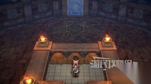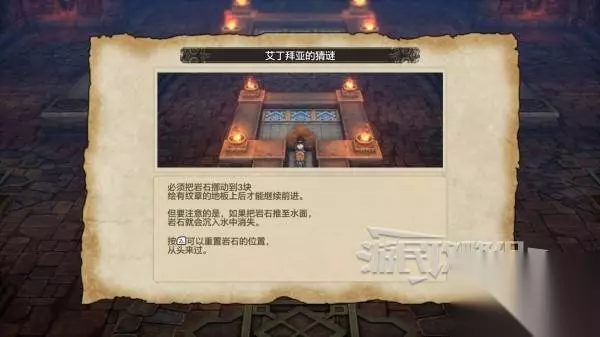 这里需要完成一个推箱子解谜,把三块石头推到前方的带纹章的地板上,石头的附近还有水格子,小心避开这些水格,否则石头就会消失。具体解谜步骤请参考这篇攻略。
