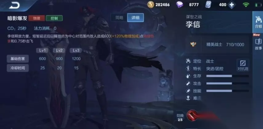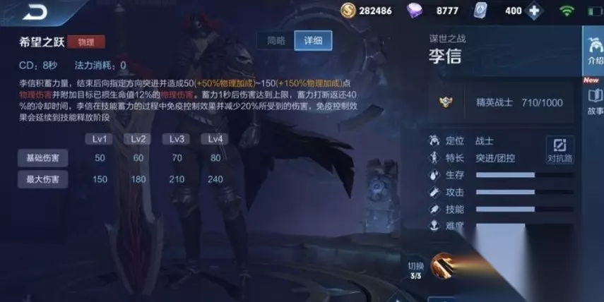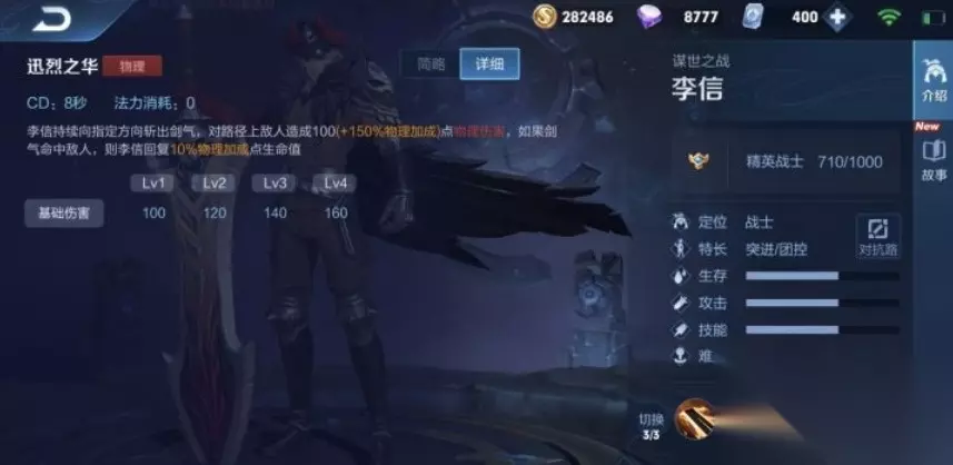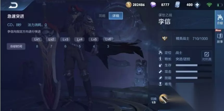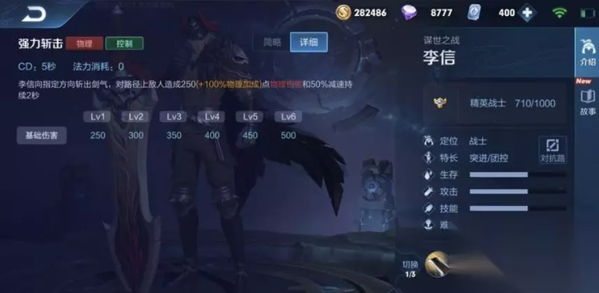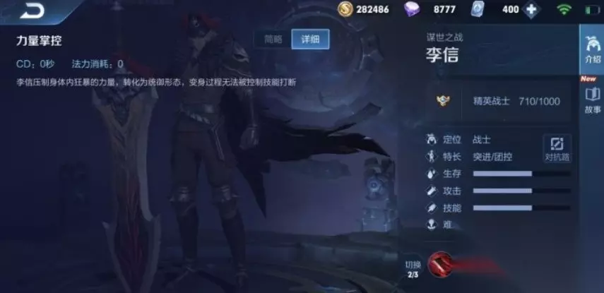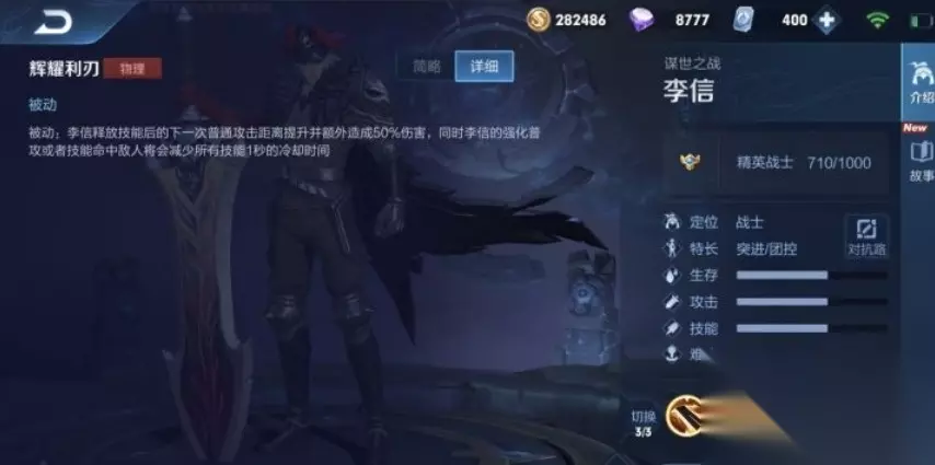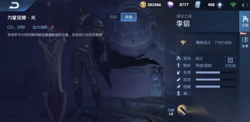5、三技能:切换光信李信力量觉醒,改变战斗形态至统御。当李信到达四级时,可瞬间切换至光信。