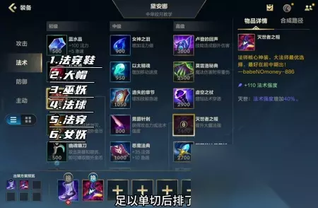 ·出装方面,我的件选择是法穿鞋,不回蓝效果,还能大大提高前期的跑图能力。 ·第二件,直接出大帽。此时,皎月的一套技能伤害已经足以单杀后排了。 ·接下来,第三件我选择了乌妖。乌妖的被动配合皎月的第三次平a伤害爆发非常高。 ·第四件可以在法爆和法穿之间做出选择。如果对面整体阵容比较脆,就先出法球再出法穿。