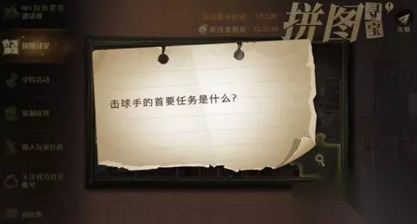 线索:击球手的首要任务是什么。 位置:【魁地奇球场】-【萝宾】。 路线: 1、根据击球手的线索玩家需要来到【魁地奇球场】,然后在左边的位置找到萝宾。 2、点击拼图碎片标志进行对话然后得知需要进行战斗。 3、这个时候玩家需要选择系统预设的卡组进行战斗。 4、打败萝宾玩家就可以拿到本次的拼图碎片了。 第三个碎片