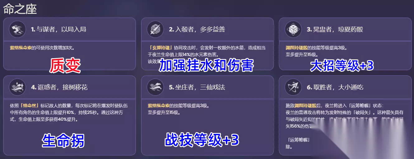 以上六种配队思路,前四种最为常用,后两种可以作为常规思路玩腻了以后的拓展玩法。另外由于夜兰增伤机制的普适性,她也能和流浪者、魈、优菈等主C组队,配队肯定远不止以上这些,这里就不一一列举了。 命座分析和抽取优先度 0命夜兰的机制和伤害就已经能给不少队伍带来质变了,但夜兰强就强在她的命座效果也很突出。一命可以说是原神角色里最值得拥有的几个一命之一,双E对大世界跑图和解决充能问题效果显著。二命提供额外挂水和伤害,主要作用是单水入队时保证水底避免火C反向打工,二命的主要需求对象是夜兰单水入队的胡桃队。四命是目前为数不多的生命拐,根据络命丝标记敌人的数量给全队加生命上限。六命则是解锁新玩法,让夜兰开大后获得相当恐怖的短轴爆发输出。