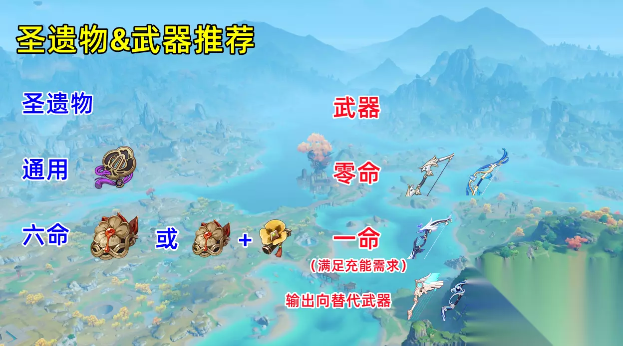 所以就算是绝缘套,满足充能的前提下同样推荐优先选生命沙。但注意前提是满足充能,零命如果搭配终末弓,如果带生命沙只有将近或者不到200的充能,且队伍里没有行秋或雷神辅助充能的话,大招很难循环,此时就应该优先考虑充能沙。 武器方面,零命优先选择西风弓,有终末弓可选终末,但要多堆点充能。专武更推荐一命及以上夜兰携带,零命带专武除非有队友协助否则较难循环。另外在满足充能循环的前提(最好是一命)下,从五星的天空之翼,到四星的曚云之月、绝弦,再到三星的弹弓、反曲弓和神射手之誓,均可以作为专武以外的输出向替代武器。