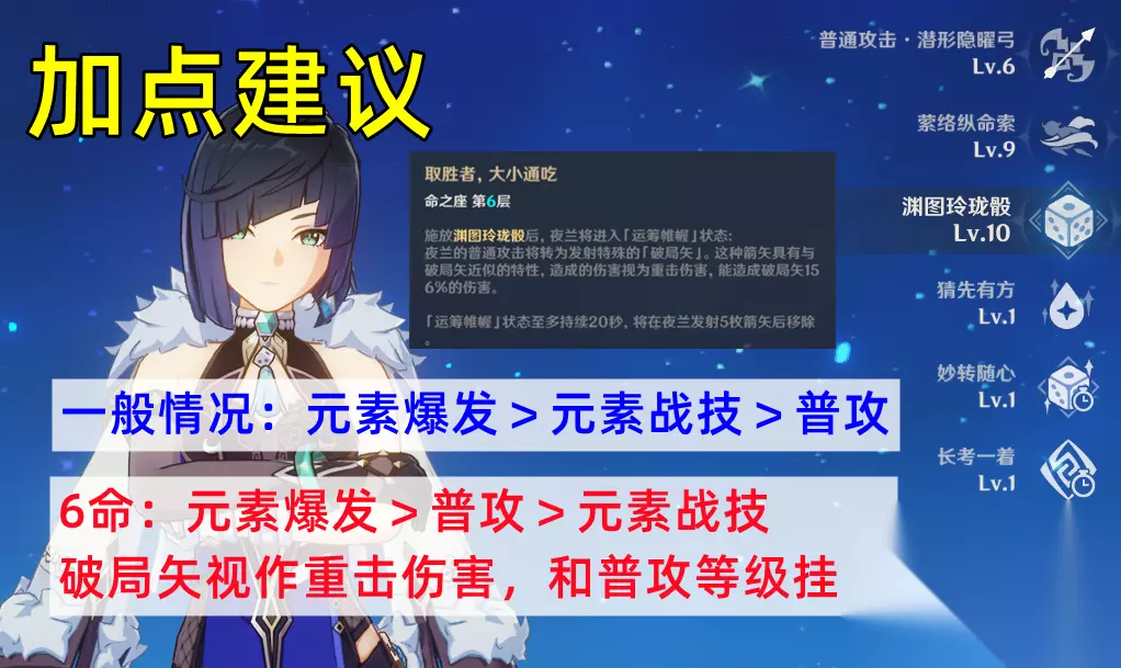 夜兰的操作手法相对简单,一般情况下先E再Q,保证产球让夜兰自己吃到即可:零命EQ,一命EEQ或EQE,六命开大后AAAAA。 加点建议 一般情况下,夜兰的天赋升级优先级为元素爆发>元素战技>普攻,普攻可不点。另外还有一种特殊情况,由于6命触发的破局矢视为重击伤害,倍率和普攻天赋挂钩,并且是相当重要的输出手段,所以6命夜兰的普攻天赋同样需要尽量升高等级,优先级为元素爆发>普攻>元素战技。