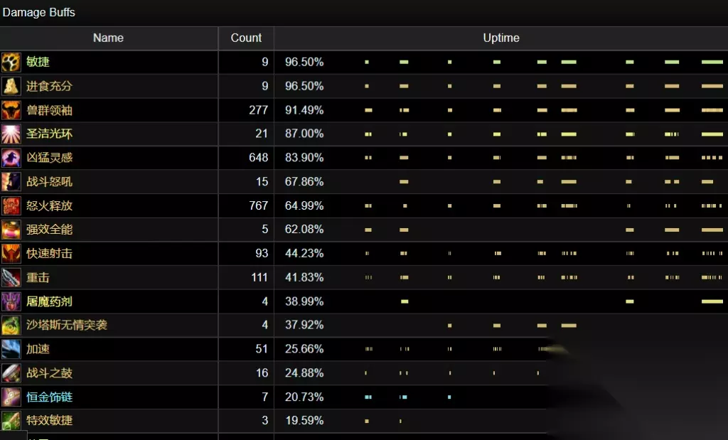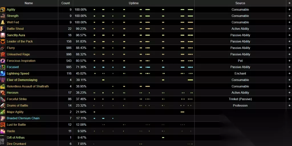 这是狂暴战的BUFF表,Forceful Strike就是饰品的300破甲特效,触发次数为92次,覆盖率为37.58%,虽然比猎人低了一点点,但也非常不错了,足以取代海啸护符的地位。 增强萨使用背叛者的疯狂数据分析