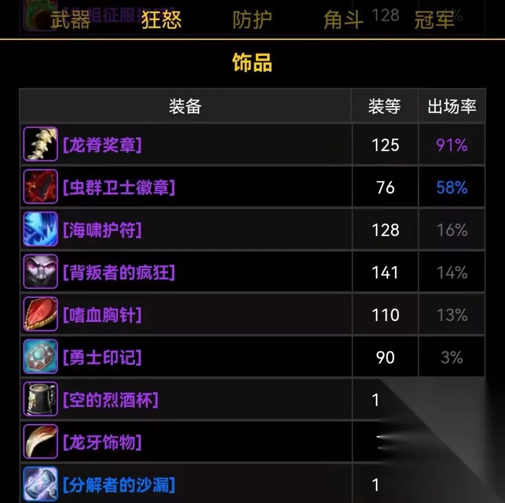 从以上数据看背叛者的疯狂特效覆盖率达到了35%~40%,这个数据证明了它的价值,想要追求极限DPS的玩家千万不要错过这件极品饰品,当然P4、P5的好饰品还有很多,22万金还是贵得太离谱了,小探建议大家随大流花费2万金入手就可以了,没必要当冤大头,大家说是吧?