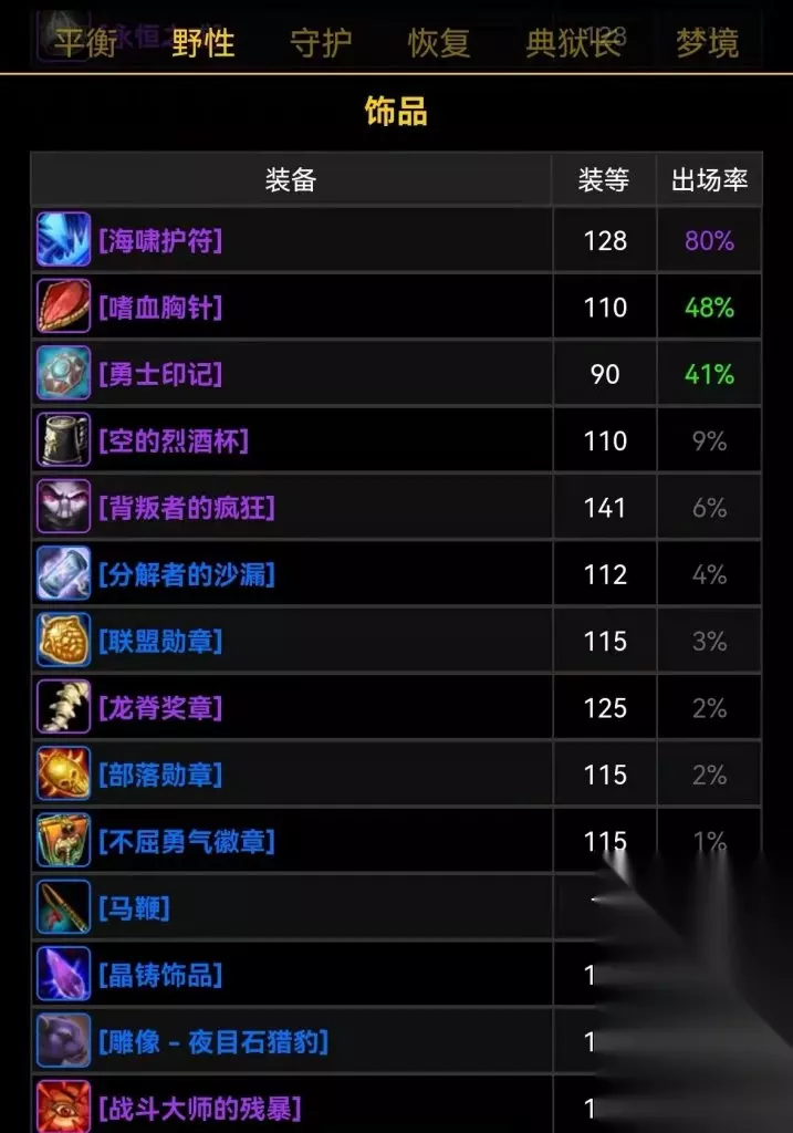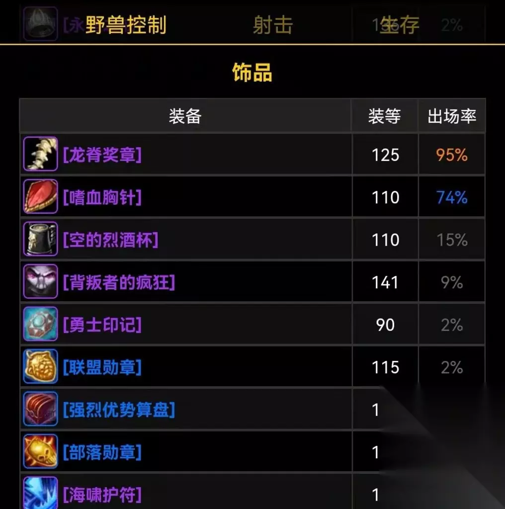 首先来看兽王猎,短短4个CD,就已经有9%猎人玩家使用了背叛者的疯狂,追上烈酒杯指日可待,而P2的海啸护符出场率才1%。