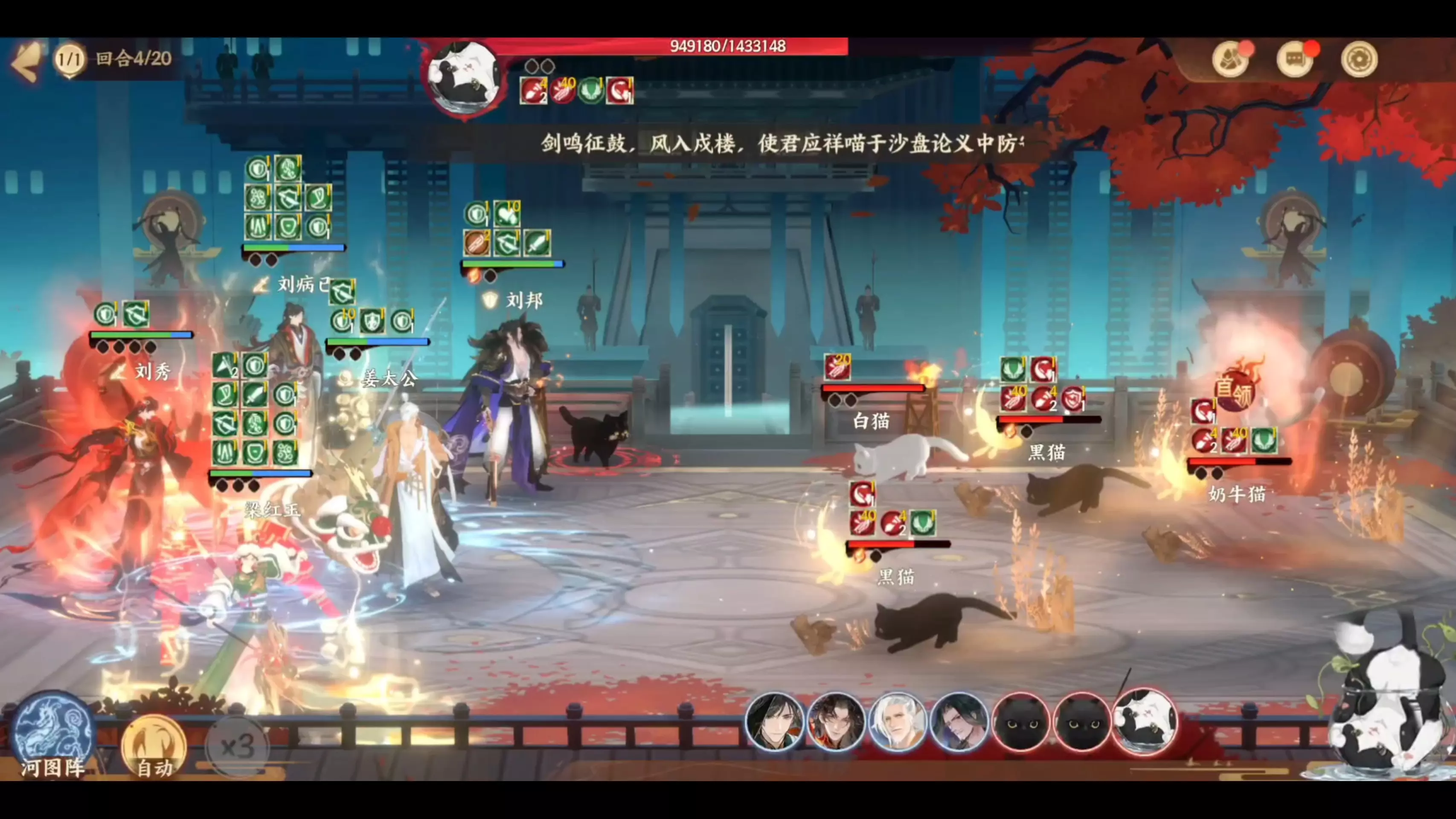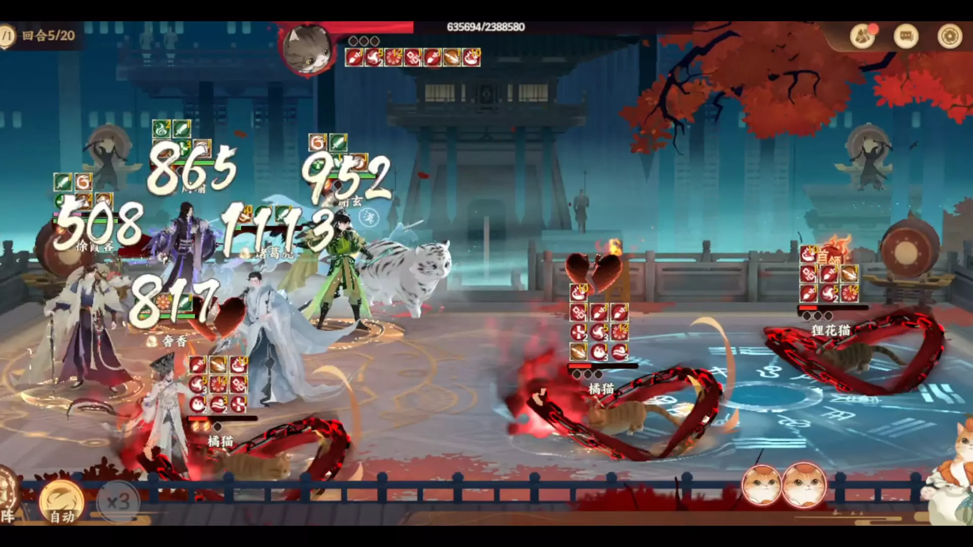 这是忘川风华录3月的喵喵大暴走玩法内容,展示了无群攻阵容挑战喵天有汉关卡,下半场仅用6回合完成战斗的过程,呈现了战斗中的阵容搭配与战斗画面。