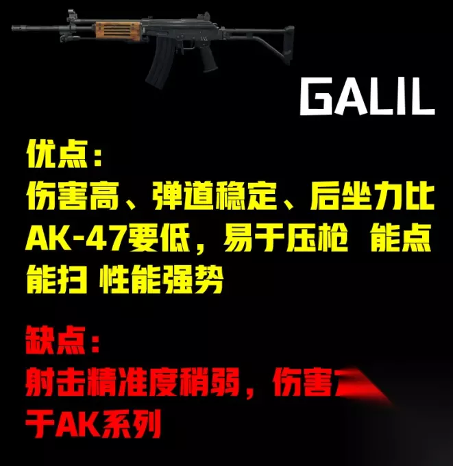 本期介绍一下强势步枪Galil。这把枪名字的叫法:咖喱 这把枪在我的印象里,它是一把较为强势的全自动步枪。拥有高伤害、弹道稳定、能点能扫等优点,对刚接触CFHD新手玩家来说相对友好。 入手价格