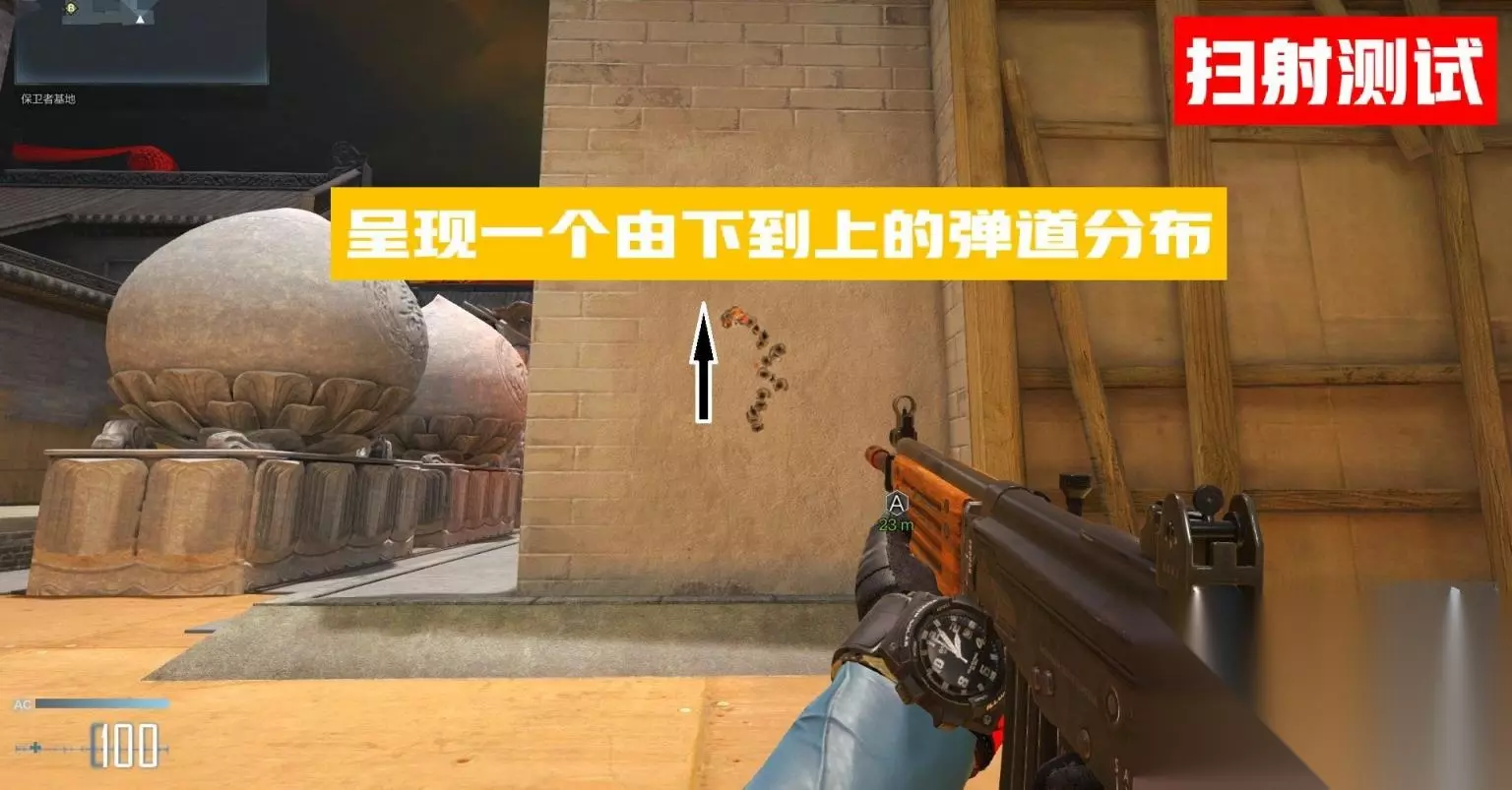 实测咖喱以速点的方式打完30发,打出来的弹痕很集中。可以证明咖喱的速点能力占据优势。实战中面对中距离的敌人时,咖喱的前几发的速点也会表现得极其稳定。 武器弹道:扫射