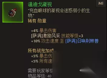 最终,当我们把所有的主要技能、被动和buff点满之后,一个BD的技能组合就基本成型了,如果有余下的点数可以投资到一些重要性较低的技能里。 第三步:装备什么的不能急 当我们决定好职业和技能,真正进入游戏之后,就需要武装自己了。新角色在装备上不用急,也急不来,因为并没有什么速成的办法,跟着任务走,慢慢就会积攒起一些装备。在游戏初期阶段,我们是几乎没有人权的,游戏给你发什么就穿什么。 既然我们是召唤师,在装备上自然也要选择有战宠加成的,并且尽量选择和宝宝的伤害属性一致的装备。比如我们的骷髅怪和荆棘兽,都有物理伤害,那么加成物理伤害或者全部伤害的装备都可以。