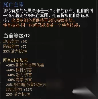 在不涉及装备的情况下,这四种召唤物可以任意选择,相较之下,原始之灵是大招,疫病恶魔需要的技能点较多,而骷髅怪和荆棘兽是可以在游戏初期就能召唤到的,所以我们很自然地先收了这两个小弟。随后,当我们在专精中投入更多的点数时,就可以放弃骷髅复生,并将这部分技能点投入到疫病恶魔中,别忘了重置技能点是很便宜的。 注:恐怖黎明的技能机制要求玩家在职业专精中投入技能点来解锁技能。例如,骷髅怪只需要1点专精点就能学习,而原始之灵需要50点(50点为上限)。 在决定了两个主要技能之后,下一步就是围绕他们进行技能搭配。首先,是点满主要技能。需要注意的是游戏内带方框的技能均为主动技能,圆形的则是被动,而与主动技能有连线的则是单独加成这一技能的被动