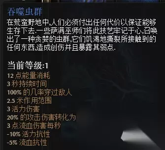当我们拥有4件套的时候,除了高额的伤害加成,我们还可以多召唤一只绿胖子疫病恶魔。另外,吞噬虫群这个技能还附带了20%的减毒酸抗性,这在原本的技能中是不存在的。我们要做的就是从其他技能中省出一个技能点分配给吞噬虫群。这样,这个BD的最终形态就算是基本完成了,我们也瞬间起飞了。