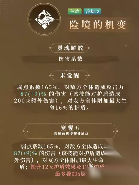 花梨的主动技能“险境的机变”,冷却时间是两个回合,在未觉醒时,其弱点系数为165%,可以对全体敌方单位造成,基础攻击倍率为87%的伤害,如果敌方单位处于护盾加持状态,那么该伤害倍率会增加200%。 同时,花梨在释放主动技能“险境的机变”期间,还可以对友方的全体目标,附加一层基于自身最大生命数值16%的护盾效果,这一个技能也让花梨成为了主要的辅助型输出单位。
