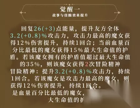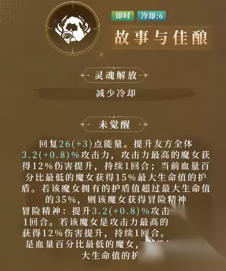 花梨的大招技能是“故事与佳酿”, 该技能效果的特点是进行冷却时间的减少,在未觉醒时,可以直接恢复自身能量的26点,同时提升有方全体攻击数值的3.2%,在其中攻击力最高的友方单位,可以直接获取12%伤害提升。 该buff的持续时间是一个回合,并且在释放大招的期间,花梨还可以为当前血量最低的队友,提供一个基于释放者最大生命数值15%的护盾,如若该角色所获取的护盾数值,已经超过了其最大生命数值35%,那么获取护盾的单位,将会在取得一层攻击力加成效果,该效果的基础攻击倍率为3.2%。