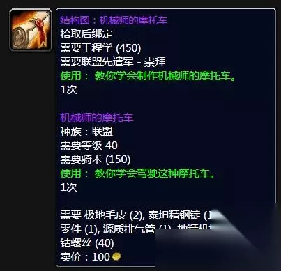 《魔兽世界》怀旧服WLK机械师的摩托车图纸获得方法 工程等级:工程450级 声望需求:联盟先遣军 - 崇拜 在玩家到达对应工程等级后,玩家前往联盟先遣军军需官NPC处花费400金币即可购买。部落玩家无法获得机械师的摩托车。 NPC位置: 后勤官员布莱顿 <联盟先遣军军需官>:嚎风峡湾(59.6,64.0) 后勤官希瓦丝顿 <联盟先遣军军需官>:北风苔原(57.7,66.4) 装备属性: