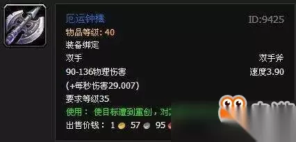厄运钟摆只是一把39级的蓝色武器,在稀有度方面与上面几把武器相比要逊色很多,但它的名气丝毫不输给上面这些神器。这个原因就要追溯到70~80级年代盛行的“小号战场”。 当时国服版本更新非常缓慢,与世界服的版本经常相差1~2个版本,经常是世界服已经玩腻了国服还没更新版本,这就让很多国服玩家失望。于是无聊的玩家们开始练一些小号玩战场,其中U39战场最受欢迎,而这把厄运钟摆因为4.0的超慢攻速,有着逆天的伤害,成了战士、猎人等职业的终极武器。 只要有了它,U39战场堪称无敌!因为厄运钟摆的掉率极低,后来又因为改版被移除,所以这把武器的市场价一度逆天。是那种有钱都难以买到的神器。 绿色荧光陆行鸟