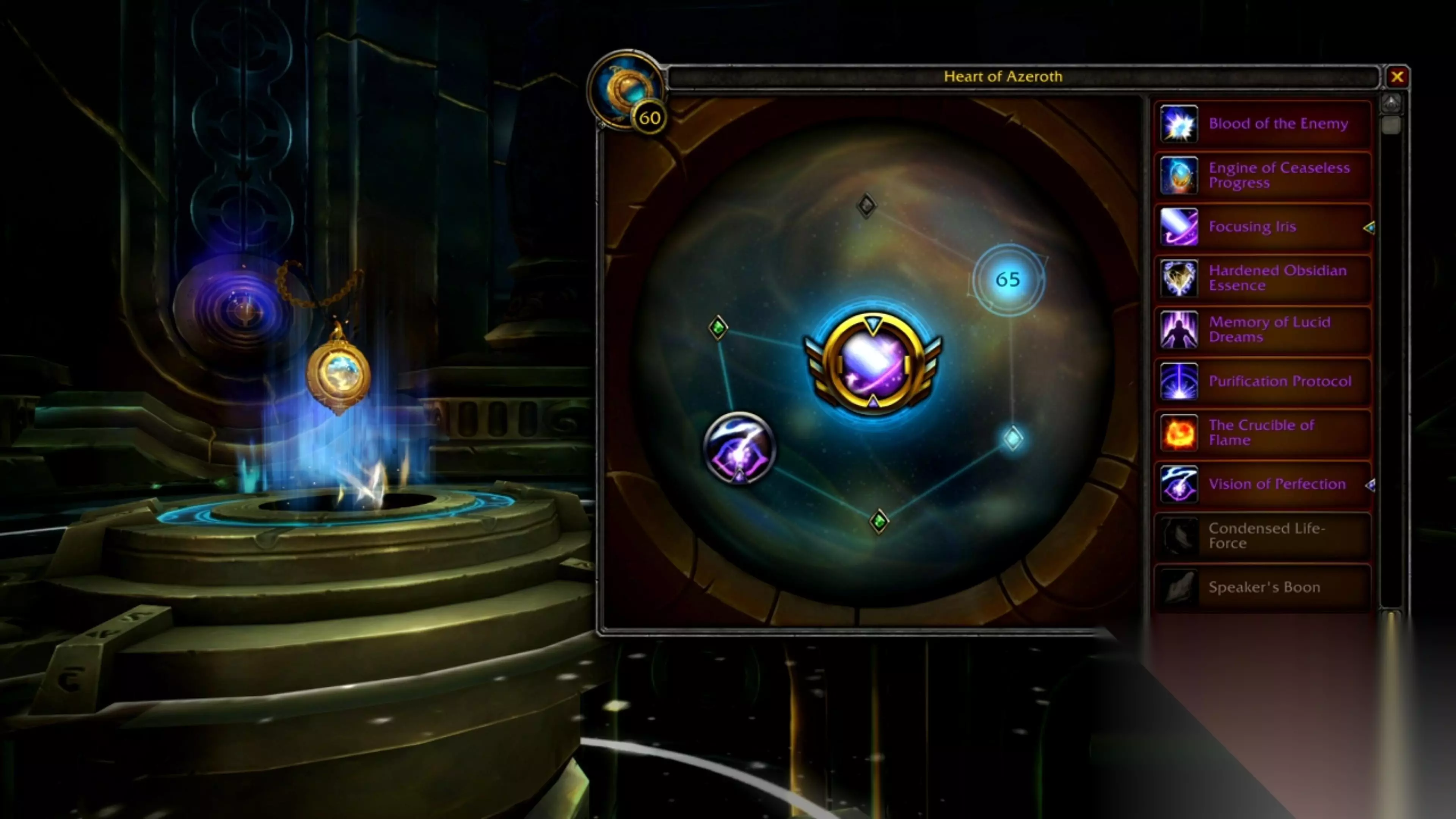 在完成麦格尼给予的起始任务之后,玩家就可以解锁艾泽拉斯之心的主插槽,之后在项链达到55级和65级时还会分别解锁次插槽。每种精华都拥有主能力(一般为主动)和副能力(被动),插入主插槽的精华能同时发挥两种能力,插入次插槽的则会激活次要技能。 在获得某个精华后,你可以前往希利苏斯的心之密室永久得习得这种精华,并像天赋一样在安全区域进行切换调整。精华可以通过任务、大米、PvP、团队副本或世界任务来获得,精华的来源是固定的。