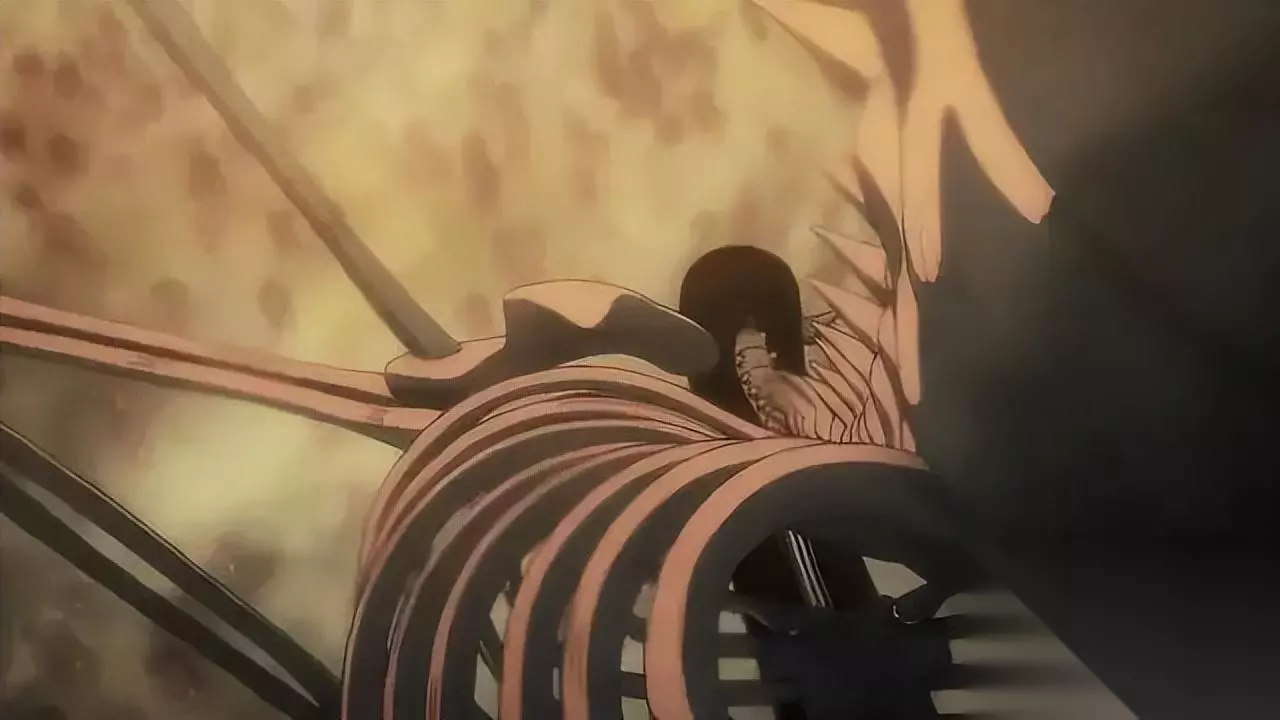 MAPPA的作画有肉眼可见的进步,这时MAPPA笔下的《巨人》,早已见不到「马莱篇」刚从WIT接手时制作上的捉襟见肘,韩吉最后一战中的2D作画,画面细节与剪辑节奏的把握,酣畅淋漓。对比隔壁时常在动作戏里三渲二节省成本的《电锯人》,MAPPA为巨人系列的最后一舞显然是下了血本。 影片末尾,艾尔敏望着面前拖着历代巨人的骨架如虫般蠕行的艾伦,喃喃道,「你到底哪里自由了?」艾伦眼眶充血,目色空洞,头颅被吊在累累骨架上,活脱脱一个傀儡的形象。 「完结篇-前篇」至此戛然而止,却使这句问话在黑暗中久久荡起刺痛的回声。 自由。墙内人曾经以为,火焰的水,结冰的原野,砂的雪地,凡是看过这些的人,将是这世界上最自由的人。